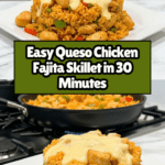 Keywords: Queso chicken fajita skillet, fajita chicken recipe, easy Tex-Mex skillet, one-pan chicken fajitas, quick chicken skillet, cheese dip chicken fajitas