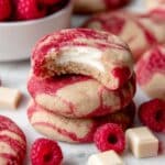 Delight in these Raspberry White Chocolate Cheesecake Cookies, featuring a creamy white chocolate cheesecake center surrounded by a luscious raspberry jam swirled cookie dough. These cookies combine a smooth, tangy filling with sweet, tart raspberry pockets, creating an irresistible balance of flavors and textures perfect for any dessert lover.