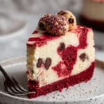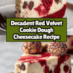 This Red Velvet Cookie Dough Cheesecake combines a rich red velvet crust with edible chocolate chip cookie dough balls and a smooth cheesecake filling for an indulgent dessert that’s both visually stunning and decadently delicious.