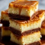 The image shows a stack of square dessert bars on a brown tray, each bar has three layers: the bottom layer is a thick, dark brown crust, the middle layer is a creamy, light yellow filling, and the top layer is golden brown with a smooth caramel drizzle creating a shiny texture. The bars look soft and moist with slightly crumbly edges. The background is a white marbled texture. photo taken with an iphone --ar 4:5 --v 7