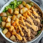 5. Assemble the Bowls: Start by adding the crispy air-fried potatoes to each bowl. Layer on the smashed cooked ground beef, then add the caramelized onions followed by shredded cheese. Drizzle the prepared sauce over the top, then finish with fresh lettuce and pickles for crunch and freshness.