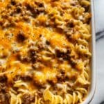 - Assemble Casserole: Transfer the noodle and beef mixture into a greased baking dish, spreading it out evenly, then sprinkle the shredded cheddar cheese on top.