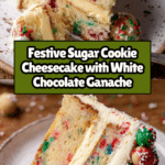 Keywords: sugar cookie cheesecake, festive cheesecake, holiday dessert, cheesecake with cookie dough, white chocolate ganache cheesecake