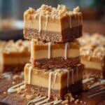 The image shows three stacked dessert bars with two clear layers each: a bottom layer that looks dense and crumbly in a rich brown color, and a smooth, creamy caramel-colored top layer. The top of the stack is decorated with small crumbly bits and drizzles of light cream-colored sauce that cascades slightly down the sides. The bars sit on a wooden board with scattered crumbs around them, and the whole scene is set against a blurred background. Photo taken with an iphone --ar 4:5 --v 7