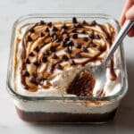 A clear glass square dish holds a layered dessert with three visible layers. The bottom layer is dark brown and smooth, likely a rich chocolate base. The middle layer is creamy white, thick and spread evenly above the dark layer. The top layer is a swirl of light brown caramel sauce spread unevenly with drizzled darker chocolate syrup creating a swirl pattern on the white cream. Scattered chocolate chips of medium size are spread across the top. A silver spoon is inserted into the right side of the dish, showing some of the dark brown layer on it. The dish rests on a white marbled surface. A woman's hand is holding the spoon. photo taken with an iphone --ar 4:5 --v 7