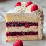 The image shows a slice of a three-layer cake on a white plate, placed on a white marbled surface. The bottom layer is dark red with a moist texture, the middle is a sweet cream-colored layer, and the top layer is the same dark red as the bottom. Between each cake layer, there is a thick spread of dark red berry jam with small pieces of berries visible. The outside of the cake is covered in smooth white cream with decorative swirls on the sides. On top, there is a neat circle of fresh red raspberries and small dollops of white cream around them. One fresh raspberry sits on the plate next to the cake slice. The photo taken with an iphone --ar 4:5 --v 7